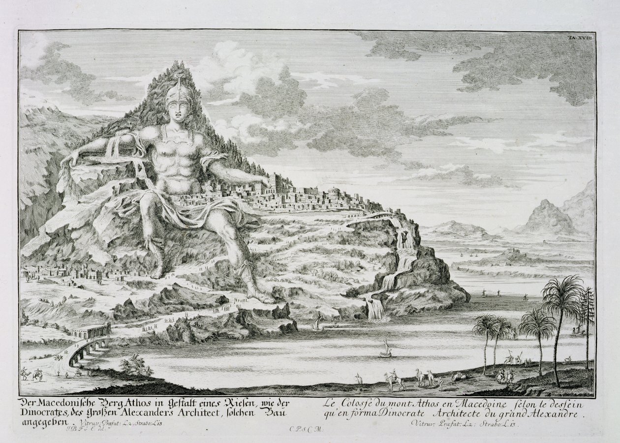 The Colossus of Mount Athos, Macedonia, a design by Dinocrates, the architect of Alexander the Great, plate 18 from 'Entwurf einer historischen Architektur', engraved by Johann Adam Delsenbach(The Colossus of Mount Athos, Macedonia, a design by Dinocrates, the architect of Alexander the Great, plate 18 from 'Entwurf einer historischen Architektur', engraved by Johann Adam Delsenbach (1687-1)Johann Bernhard Fischer von Erlach |