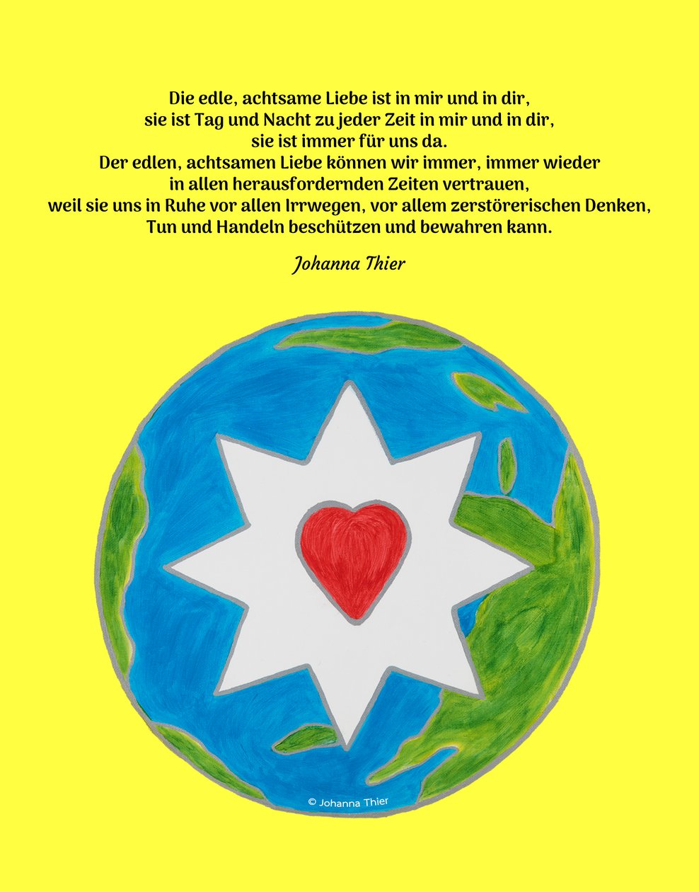 May Johanna Thier's picture of peace always give people food for thought at all levels in all challenging times and situations, so that they may always live love in their thoughts, actions and behaviour in order to sustain peace and a healthy Mother Earth at home and in all countries. Long live love on all levels for all time, long live peace on all levels for all time in all countries of this world.