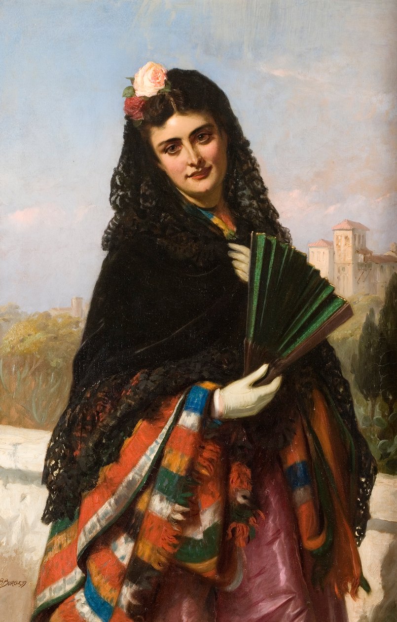 portrait · female · traditional costume · traditional dress · three-quarter length · black lace shawl · flowers · flower · roses · spanish landscape · c19th · Shipley Art Gallery, Gateshead, Tyne & Wear, UK / Bridgeman Images |