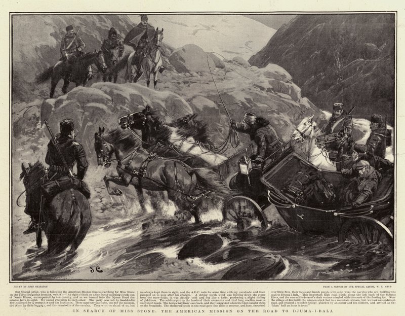 search · miss stone · american mission · road · djuma · bala · horse · drawn · transport · horses · missing persons · turkey · dramatic · Private Collection / Bridgeman Images · / Look and Learn |