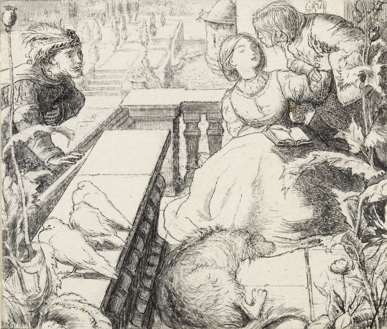 exterior · outdoors · animal · building · buildings · female · women · woman · people · male · architecture · bird · birds · sleep · sleeping · kissing · british · palace · century · britain · asleep · lady · concept · outside · awakening · attendant · balustrade · monochrome · architectural feature · 19th century · black white · black and white · nineteenth century · artistic school · pre-raphaelite · portrait · john everett millais · sir john everett millais · john everett millais ra · artistic style · millais · john everett · pre-raphaelite brotherhood · ashmolean museum · Ashmolean Museum, University of Oxford/Heritage Images