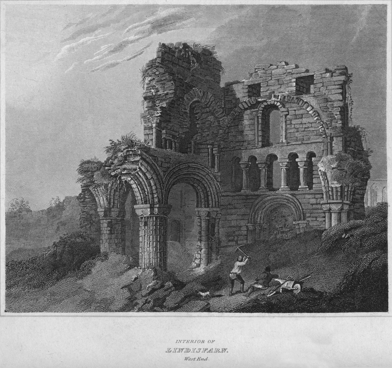 outdoors · england · people · male · interior · indoors · working · work · religious · architecture · coastal · country · religion · tool · english · northumberland · ruins · ruin · christianity · location · century · inside · overgrown · concept · ruined · border · lindisfarne · building exterior · monochrome · pickaxe · holy island · publication · 19th century · black white · black and white · background people · priory · nineteenth century · historic · lindisfarne priory · engraving · landscape · john greig · scott · walter · sir walter · sir walter scott · walter scott · longman co · greig · john · borderland · border antiquities · The Print Collector/Heritage Images