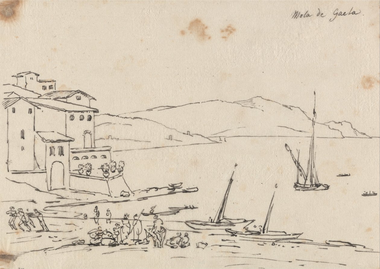 shoreline · colorless · boats · water · town · buildings · stained · hills · Mola · Gaeta