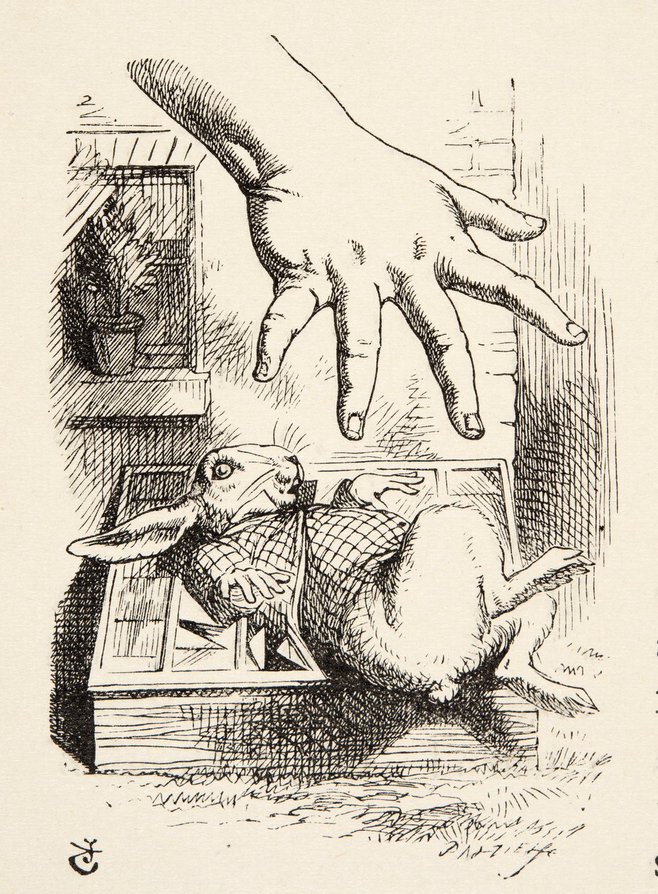 white rabbit · giant hand · alice · alice in wonderland · cold frame · broken glass · falling · animal · fingers · hand · Private Collection / Bridgeman Images