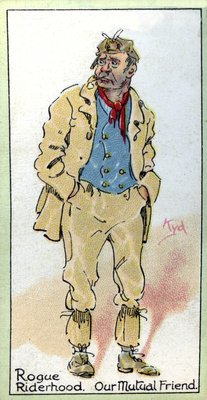 male · portrait · full length · dickensian · victorian · literature · literary · character · caricature · fiction · fictional · novel · villain · our mutual friend · rogue riderhood · unscrupulous · opportunistic · cigarette card · card · vintage card · vintage · illustration · Private Collection / Bridgeman Images