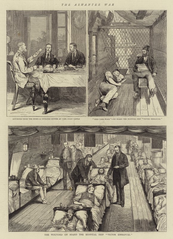 ashantee war · returned · bush · civilised dinner · cape coast castle · bird cage walk · board · hospital ship victor emmanuel · wounded · military · hospitals · third anglo ashanti war · ghana · Private Collection / Bridgeman Images · / Look and Learn |