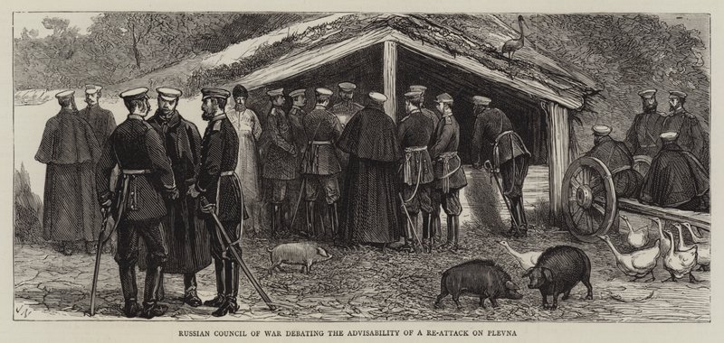russian council of war · debating · advisability · re attack · plevna · russo turkish war · military · Private Collection / Bridgeman Images · / Look and Learn |