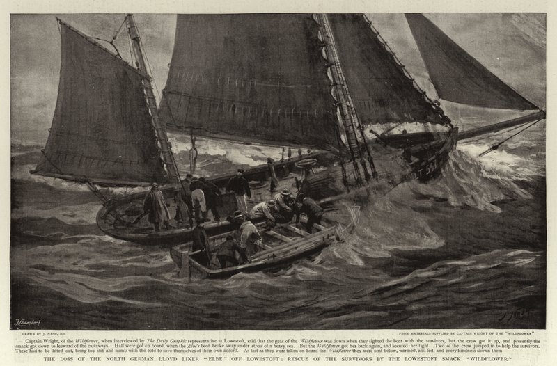 The Loss of the North German Lloyd Liner Elbe off Lowestoft, Rescue of the Survivors by the Lowestoft Smack Wildflower(The Loss of the North German Llyod Liner Elbe off Lowestoft, Rescue of the Survivors by the Lowestoft Smack Wildflower )Joseph Nash |