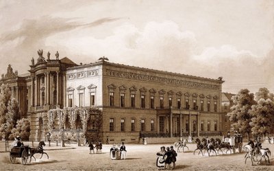 capital city · city · outdoor · window · nineteenth century · time of day · horse drawn · urban · royal building · female · library · women · city life · building exterior · entrance · bystander · on paper · landmark · 19th century painting · palace · outside · daytime · people · grand · horse-drawn · equine · watercolour · mounted on paper · historic · background people · road vehicle · public building · vehicle · royalty · european artist · facade · exterior · hooved mammal · tree · monument · animal equipment · human · plant part · water colour · view · 19th century · watercolor · overlooking · monarchy · daily life · foliage · german art · vehicles · life · artist german · scenery · front · paper · scenic · outdoors · woman · water color · mammal · plant · architecture · artist european · animal · carriage · nature · neighbourhood · ways · artist-german · scene · architectural feature · germany · pillar · palace of prince wilhelm · road transport · horsedrawn · male · equestrian · architectural · street scene · artwork · olden time · europe · transportation · german artist · routine · building · horse · trap · painting · history · karl langhans · sepia · loeillot-hartwig · streetscene · transport · berlin · statue · georg christian unger · platz am opernhaus · pediment · unter den linden · karl loeillot-hartwig · Private Collection / Bridgeman Images