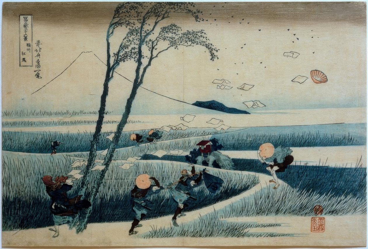 view · tree · mountain · bend · fly ash · mountain · japanese · headgear · country · people · landscape · deciduous · meteorology · reed · signature · storm · swamp · ethnology · away · wind · weather geography · asia · ejiri · fuji · japan · east asia · title · views · fuji · technology · printmaking · woodblock · graphic · woodblock · Ejiri · Provinz · Suruga · Tsuwano, Katsushika Hokusai Museum Of Art / akg-images