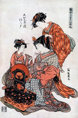 female · women · woman · people · country · costume · occupation · clothes · color · colour · comb · japan · japanese · dress · hair · traditional costume · kimono · location · century · profession · cosmetics · make-up · mirror · toilet · hairstyle · furniture · lady · lipstick · combing · maid · hairdressing · dressing table · 19th century · nineteenth century · courtesan · dressingtable · traditional dress · koriusai · The Print Collector/Heritage Images