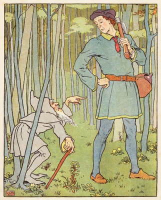 nursery stories · the golden goose · woods · costumes · little · grey · walking stick · Private Collection / Bridgeman Images |