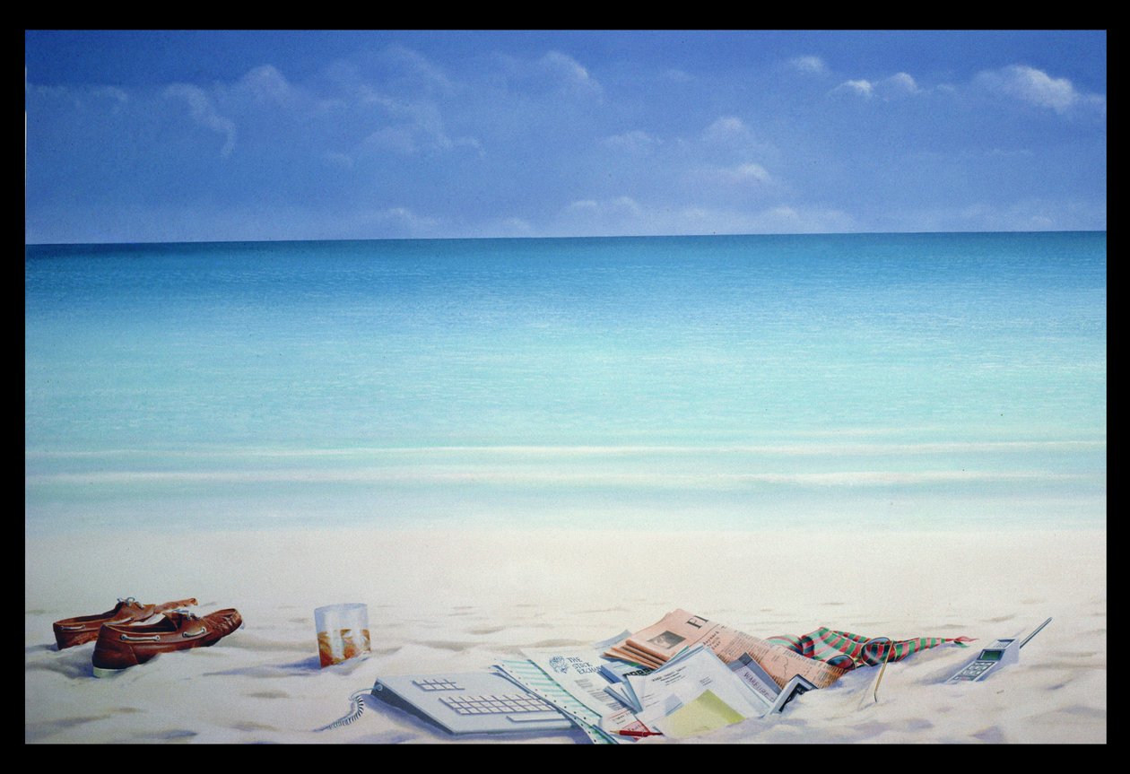 sunglasses · portable phone · financial times · loafers · drink · keyboard · mobile telephone · painting · figurative · watercolour · figure · Private Collection / Bridgeman Images