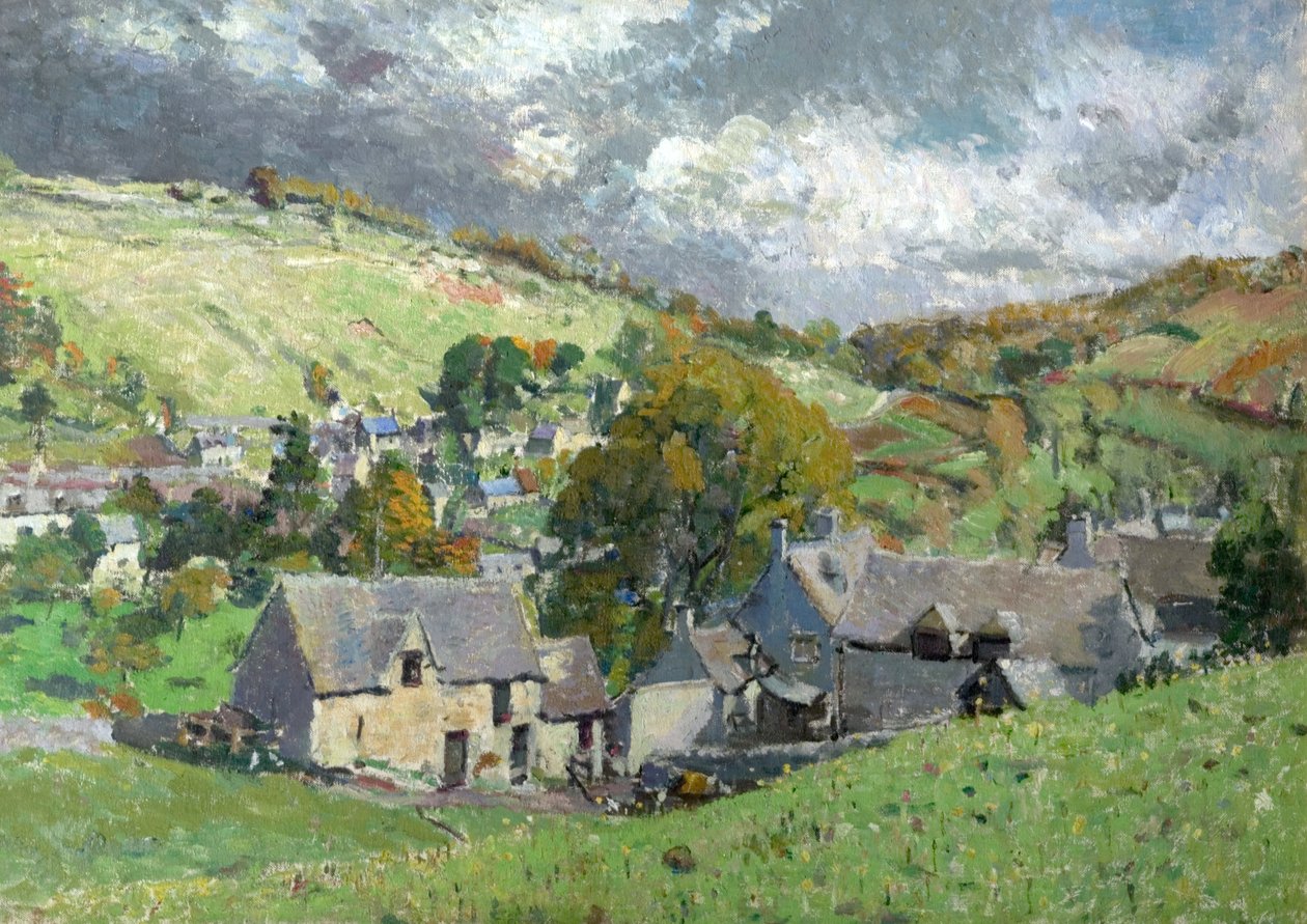 landscape · rural · settlement · england · countryside · dwelling · architecture · house · slate roof · grey sky · nestled · hill · hillside · english · green field · nestle · painting · Nottingham City Museums and Galleries (Nottingham Castle) / Bridgeman Images |
