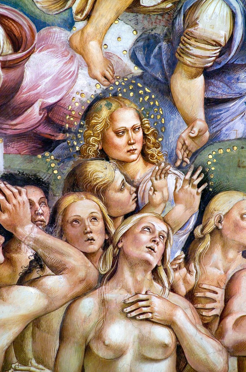 angel · angels · women · justice · part of · italian culture · fresco · umbria · crowded · medium group of people · italy · togetherness · vertical · happiness · purity · tranquility · christianity · 15th century style · full frame · human hand · innocence · safety · human foot · 15th century painting · gesturing · the last judgment · europe · religious illustration · female likeness · illustration and painting · painting · renaissance · religion · luca signorelli · orvieto · signorelli luca · / Bridgeman Images