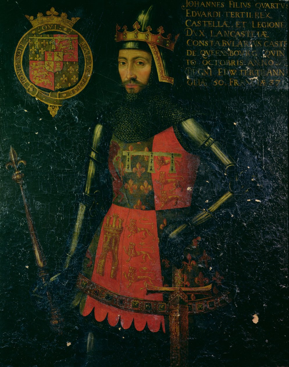 fourth · three lions · royal standard · armour · sword · house of plantagenet · male · portrait · three-quarter length · standing · formal · coat of arms · fleurs-de-lys · label of three points ermine · heraldry · heraldic achievement · medieval · Private Collection / Bridgeman Images |