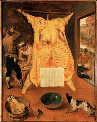 The Slaughtered Ox(Le boeuf abattu - The Slaughtered Ox - Marten van Cleve (van Cleef), the Elder (1527-1581). Oil on wood)Maerten van Cleve |