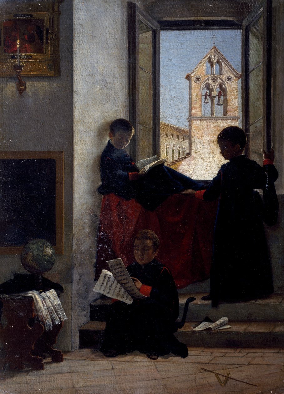 19th century · 19 century · xix century · xixth century · nineteenth century · c19th · 19 19th xix xixth century · 19 xixe xix xixe siècle · 19 nineteenth nineteenth nineteenth century · arts · colour · colours · color · coloured · colors · italy · italian · italians · european union · europe · european · europen · painting · paint · paintings · nineteenth century · reading · italian regional art across the centuries · altar boy · church · 19th century painting · centuries · standing · exercise · neapolitan school · tower · full length · fine art painting · notes · italy · childhood · togetherness · bell · school resina · vertical · singing · indoors · three people · sitting · creativity · christianity · sheet music · only boys · short hair · traditional clothing · private collection · innocence · infancy and childhood · europe · holding · painting · de gregorio marco · marco de gregorio · Private Collection / Bridgeman Images |
