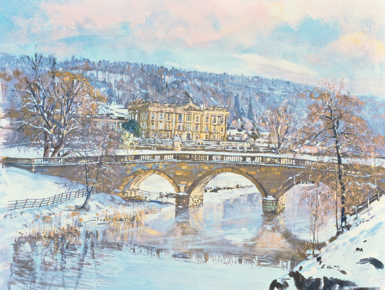 stately home · bridge · river derwent · snow · winter · landscape · house · Private Collection / Bridgeman Images |