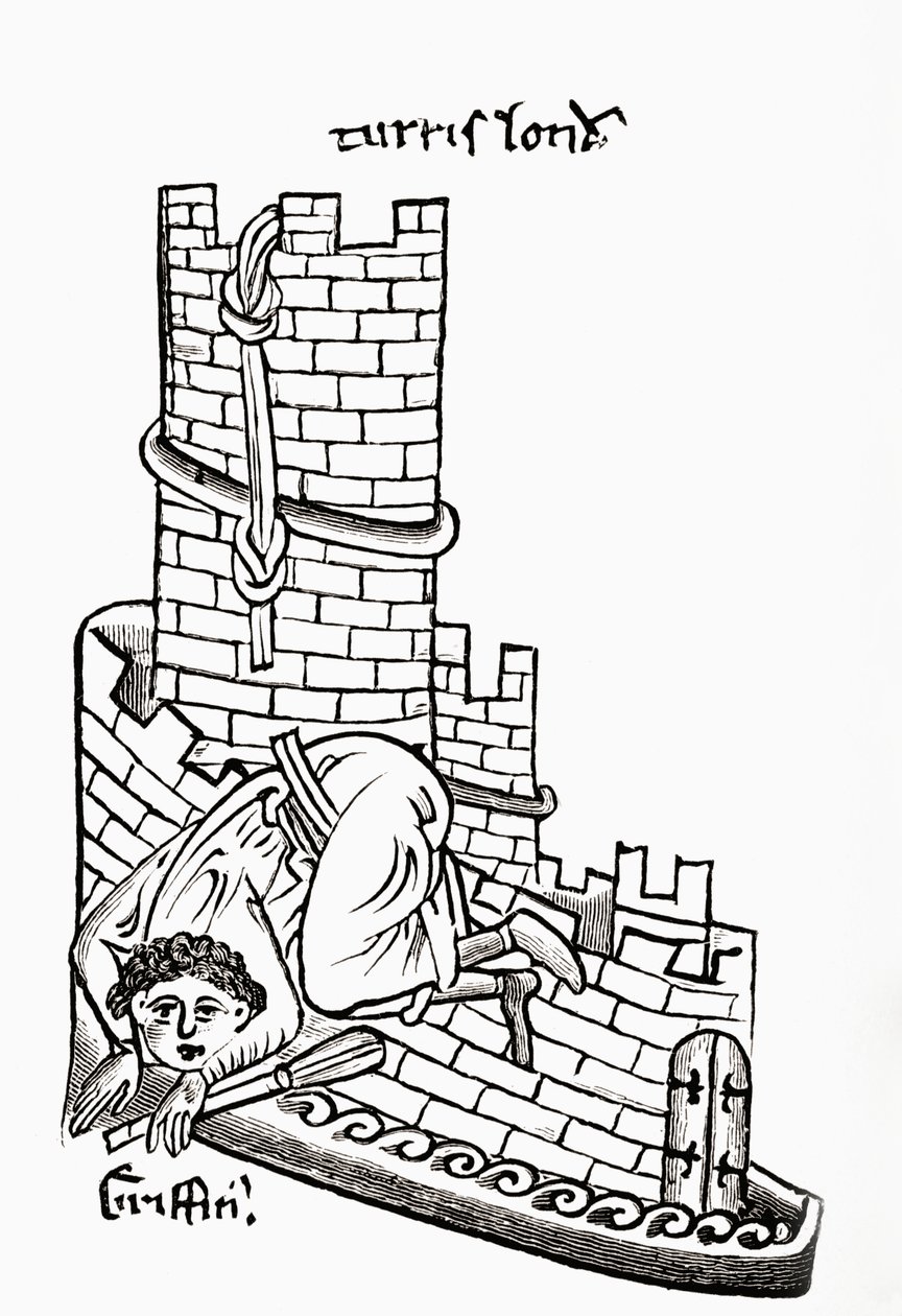 male · falling · rope · escaping · illustration · castle · medieval · middle ages · c13th · welsh · knots · knotted · moat · diving · daring · dramatic · prisoner · turret · battlements · Private Collection / Bridgeman Images |