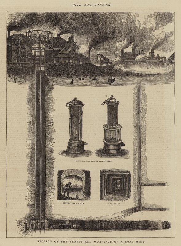 pits · pitmen · section · shafts · workings · coal mine · davy · clanny safety lamps · ventilating furnace · trap door · coal mining · Private Collection / Bridgeman Images · / Look and Learn |