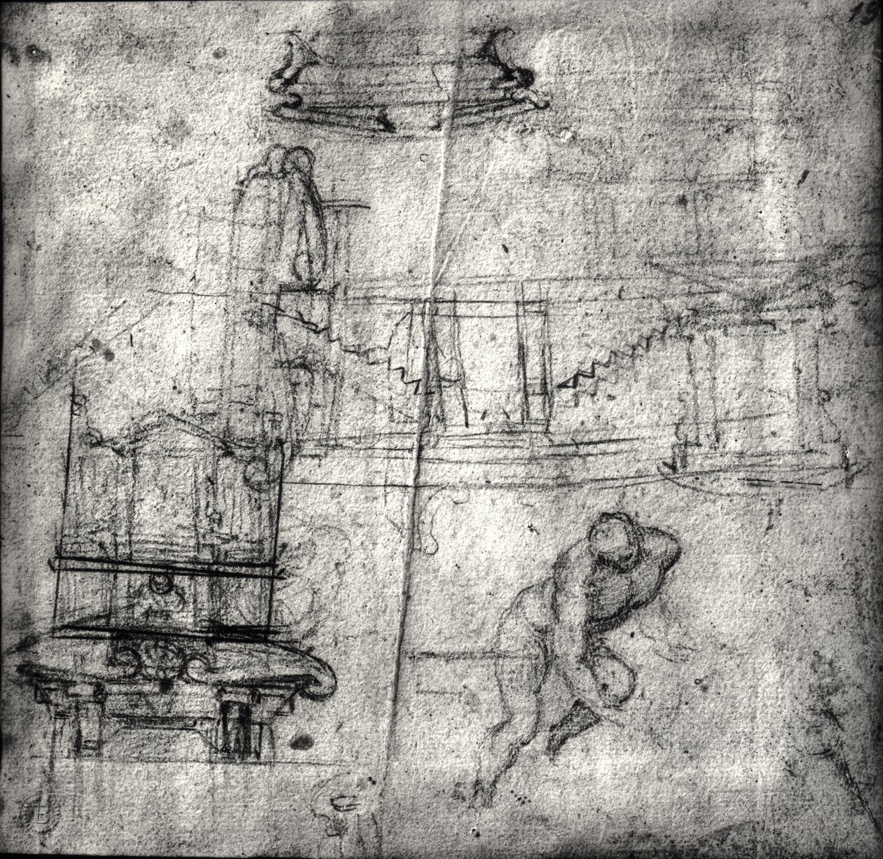 Sketch with architectural studies and a male nude(Sketch with architectural studies and a male nude )Michelangelo Buonarroti |