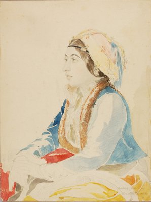 side view · female · women · woman · people · girl · girls · education · painting · country · costume · turkey · clothes · traditional · color · profile · dress · traditional costume · turkish · location · victorian · century · clothing · concept · typical · seated · colour · smithsonian institution · 19th century · educational institution · nineteenth century · scientific institution · traditional dress · watercolour · portrait · painting · heritage art · smithsonian american art museum · miner kilbourne kellogg · kellogg · miner kilbourne · pencil · colored pencil and watercolor on paper · Heritage Art/Heritage Images