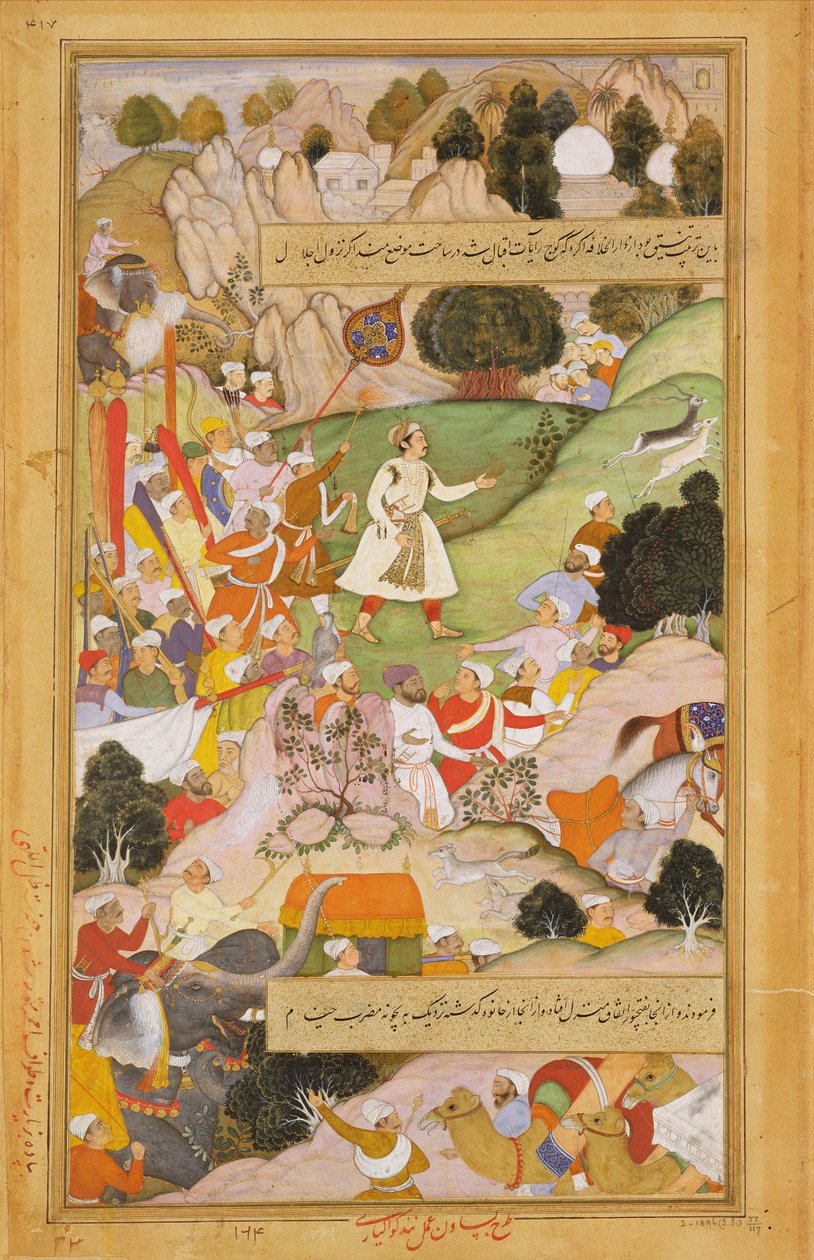 moghul · mogul · indian · miniature · akbar · r 1556-1605 · elephant · standard · retinue · camel · mountainous landscape · pilgrims · journey · Victoria & Albert Museum, London, UK / Bridgeman Images |