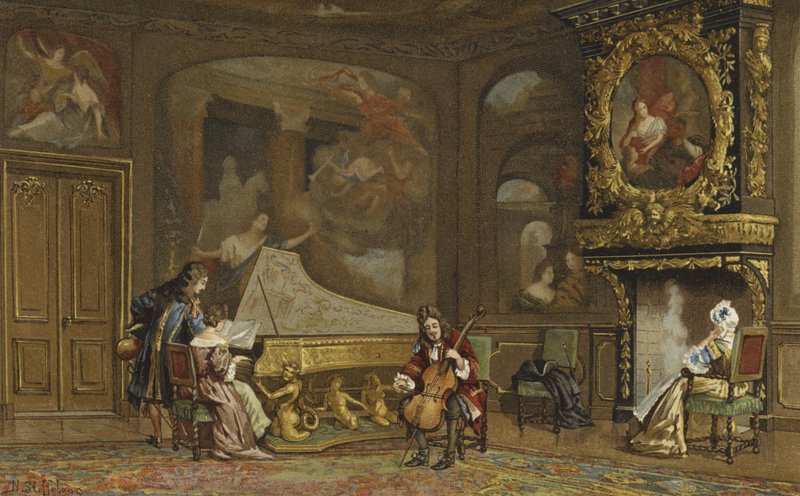 dutch · netherlands · history · 17th century · house · home · interior design · fashion · costume · dress · fireplace · ornate · paintongs · piano · cello · music · playing · musicians · entertainment · lifestyle · Private Collection / Bridgeman Images · / Look and Learn |