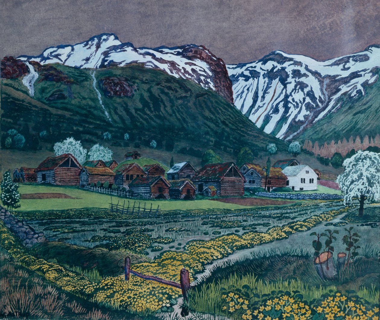 agriculture · farming · farm · ranch · mountain · flowers · night · landscape · buttercup · farm · snow · field · blomster · farming · nature · summer · house · Private Collection / Bridgeman Images