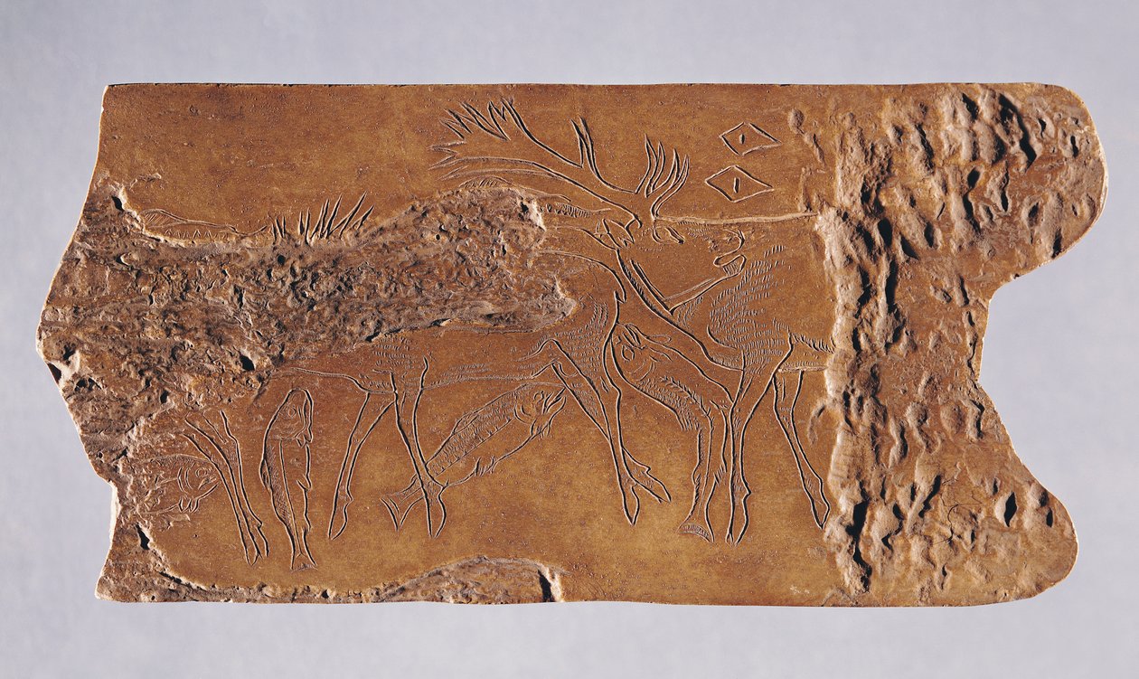 Reindeer Horn Carved with Deer and Leaping Salmon, from the Grotte de Lortet, Magdalenian(Reindeer horn carved with deer and leaping salmon, from the Grotte de Lortet, Magdalenian, 15000-18000 BC (horn))Paleolithic |