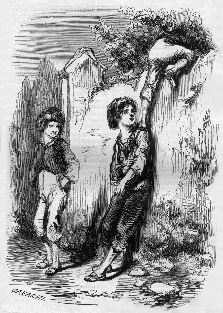 19th century · three persons · several people · climber · climbing · mountaineering · sport · fruit tree · tree · theft · crime · schoolchild · child · france · europe · fruit · food · engraving · wall · black and white · children’s literature · · / Bridgeman Images |