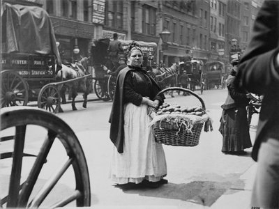 female · basket · potatoes · wheel · horse · and carriage · street · victorian · vendor · selling · salesman · saleswoman · potatoes · potato · Private Collection / Bridgeman Images