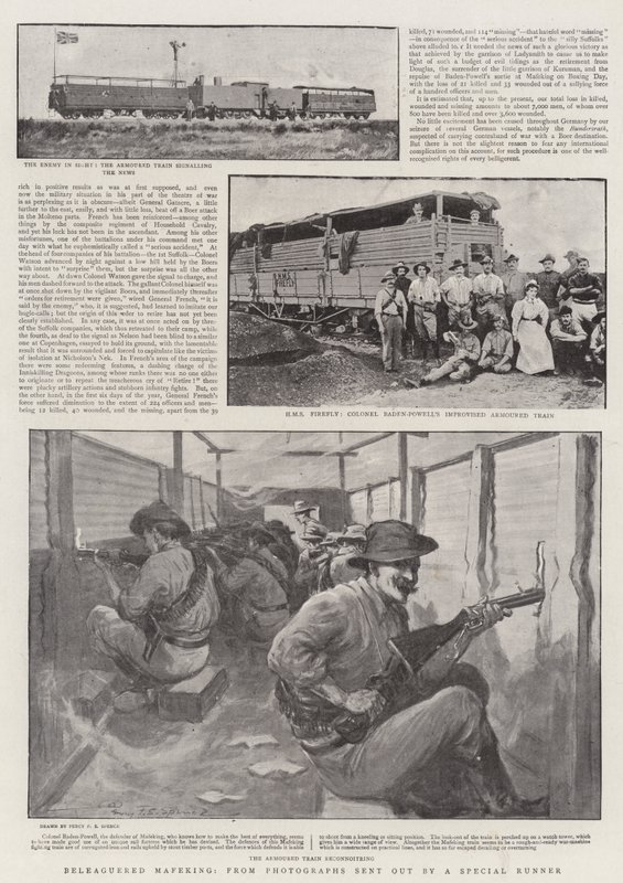 beleaguered mafeking · photographs · sent · special runner · enemy · sight · armoured train · signalling · news · hms firefly · colonel baden powells improvised armoured train · reconnoitring · south africa · military · Boer War · Private Collection / Bridgeman Images · / Look and Learn |