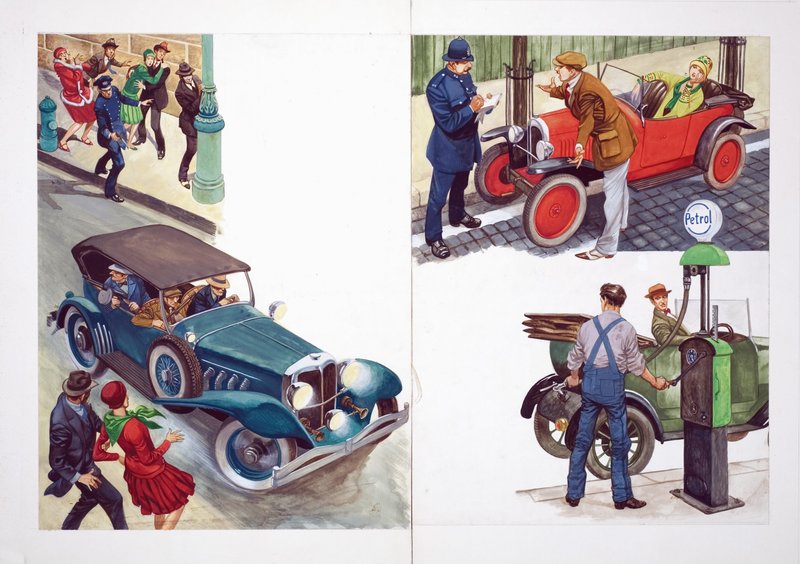 cars · gangster · petrol station · petrol pump · convertible · guns · gangsters · shooting · America · Private Collection / Bridgeman Images · / Look and Learn |