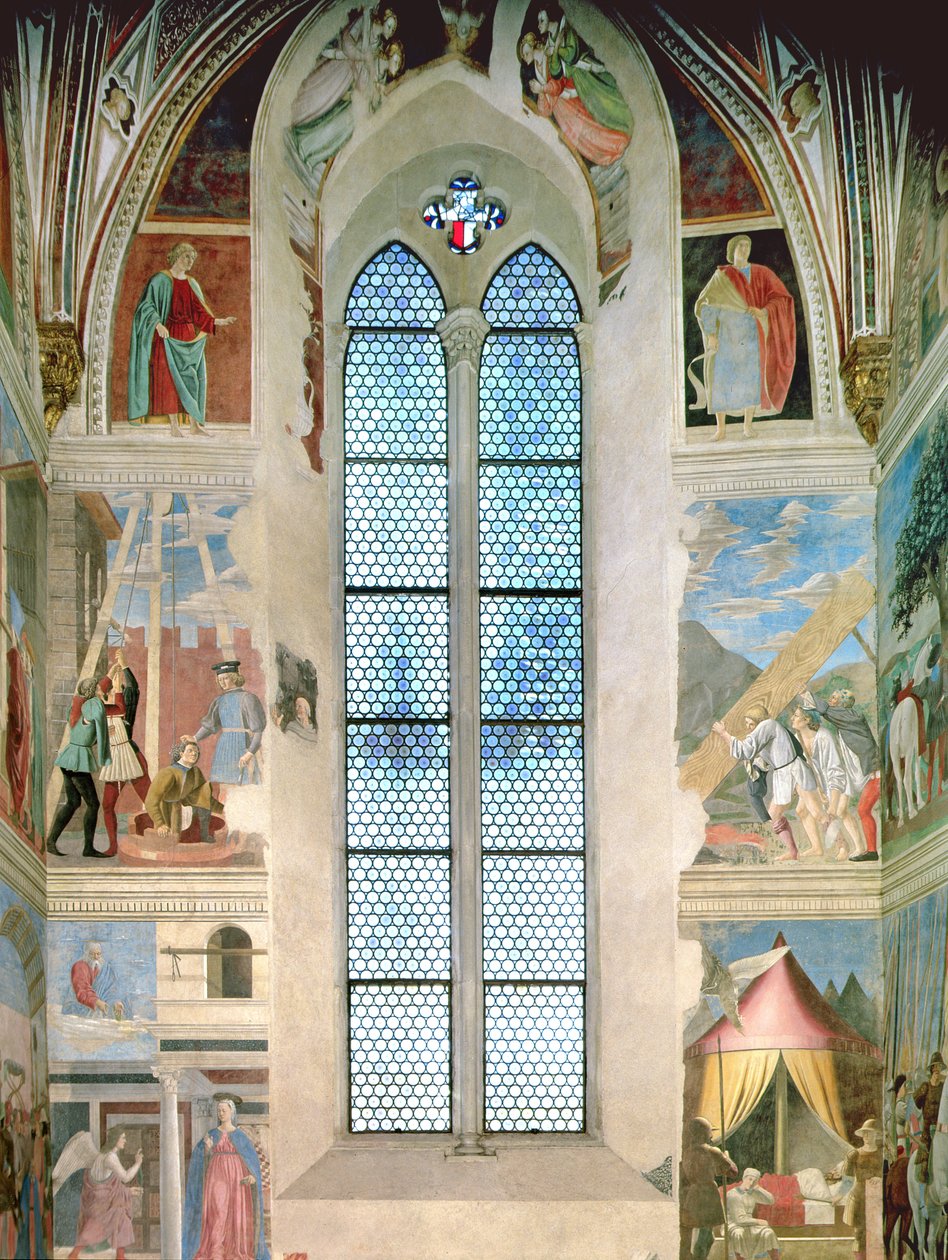 View of the end wall of the apse with frescoes from the Legend of the True Cross cycle (post-restoration)(View of the end wall of the apse with frescoes from the Legend of the True Cross cycle, completed 1464 (post-restoration))Piero della Francesca |