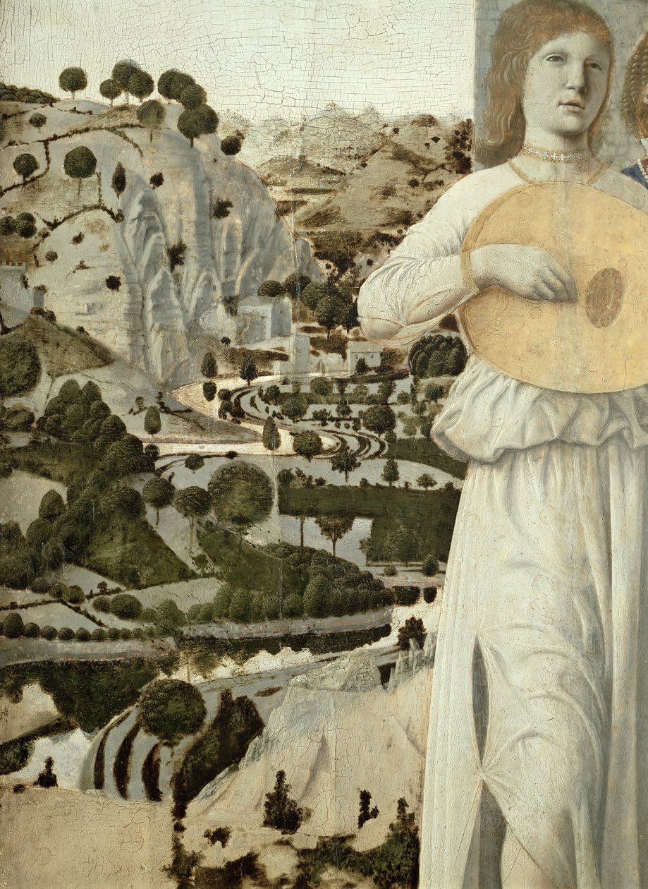 unfinished · angel · lute · renaissance · italian landscape · winding river · hills · playing music · National Gallery, London, UK / Bridgeman Images |