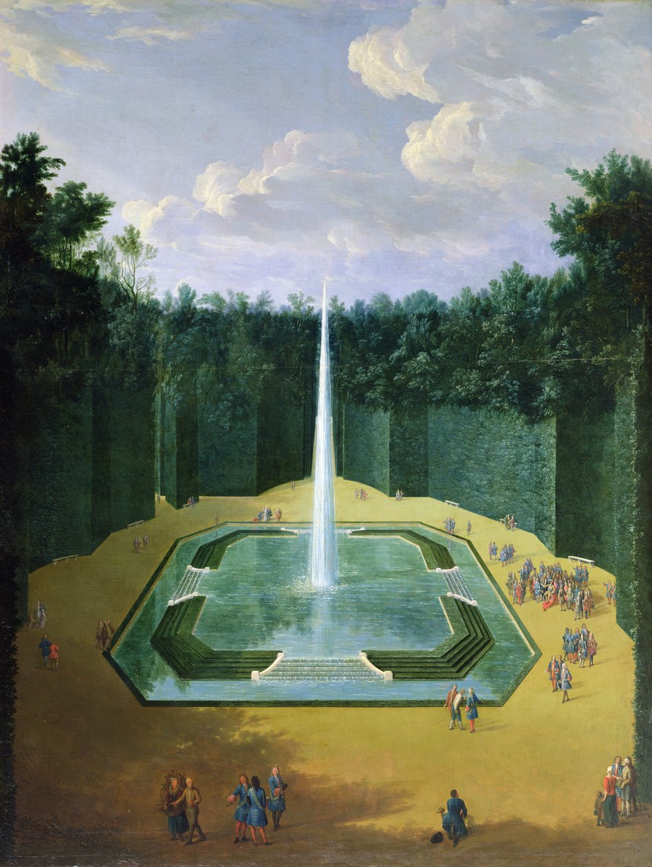 painting · fountain · obelisk · gardens · versailles · promenade · park · louis xiv · le grand · king · france · french · cour · court · hedges · entourage · figures · groups · monarchy · royalty · 18th century · Chateau du Grand Trianon, Versailles, France / Bridgeman Images |