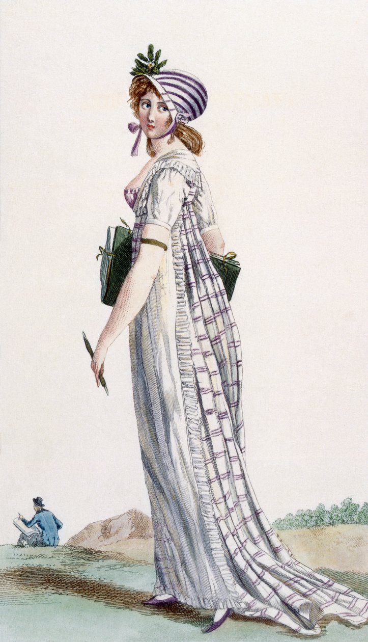 fashion · traditional costume · traditional dress · female · empire line · bonnet · standing · full length · georgian · park · paintbrush · drawing pad · paper · purple striped · landscape · artist · Private Collection / Bridgeman Images |