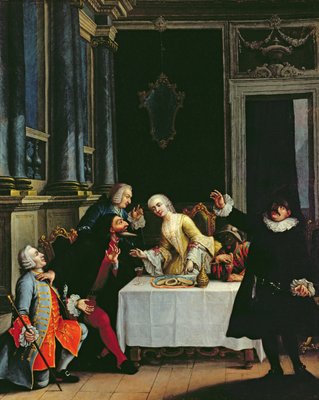 The snack with the masks (detail)("The snack with the masks"" Comedians wearing Commedia dell'arte costumes around a table where biscuits and wine are served (detail) 18th century (painting))Pietro (school of) Longhi |