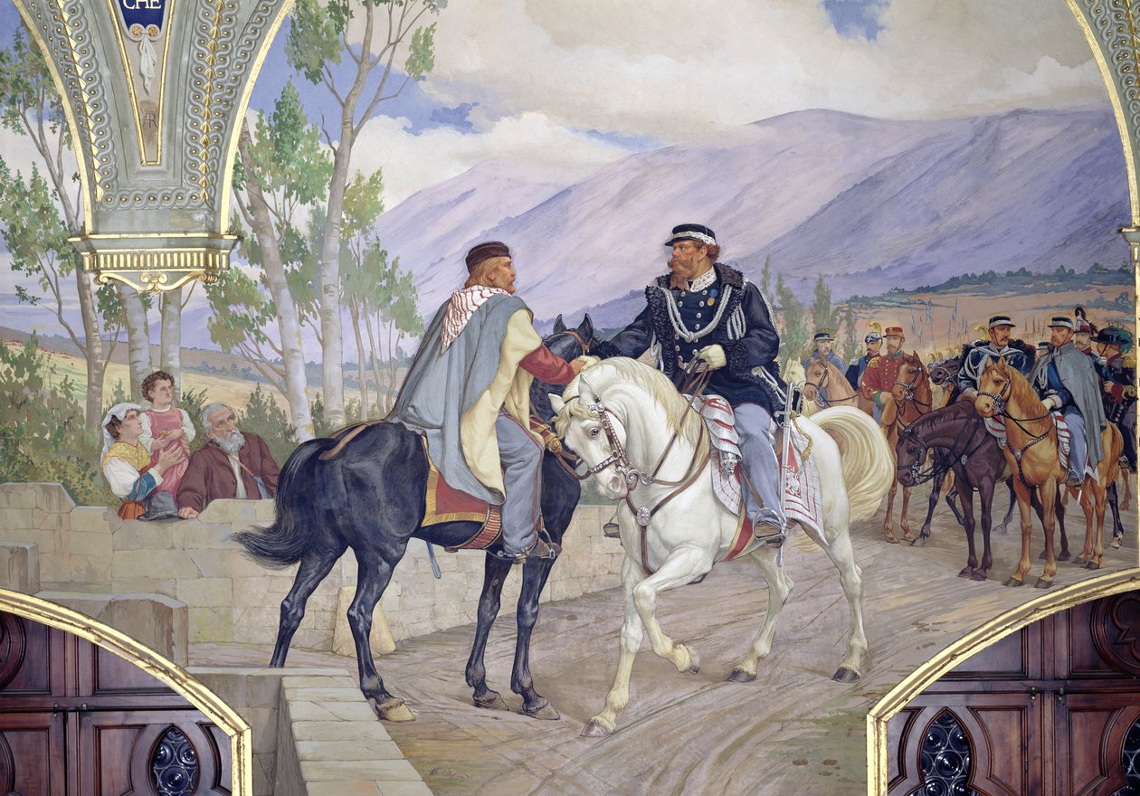 risorgimento · reunification · patriot · handshake · agreement · allies · uniform · horse · victor emmanuel ii · 1820-78 · first king of italy · king of sardinia 1849 · Palazzo Pubblico, Siena, Italy / Bridgeman Images |