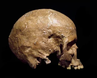Fossil Skull of Homo Sapiens Pre Neanderthal(Prehistory: fossil skull of Homo sapiens pre neanderthal (Homo steinheimensis or Homo heidelbergensis) found in Steinheim an der Murr (Germany) in 1933. Lower paleolithic. Age from 350,000 to 250,000 years. Museo Civico di Storia Naturale, Milan - Prehisto)Prehistoric Prehistoric |