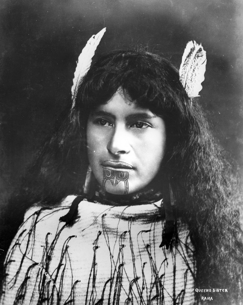 queens sister · rana · maori · female · woman · moko · facial scarification · body adornment · modification · indigenous · traditional · native · new zealand · feathers · young · royal · royalty · antipodean · australasian · portrait · portraiture · photographic · photography · Private Collection / Bridgeman Images |