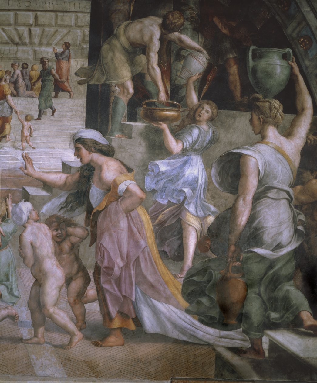 stanza della dellincendio del borgo · renaissance · frescoes · fire · flames · burning · disaster · disasters · calamity · calamities · borgo · figure · figures · despair · fear · frightened · escape · escaping · fleeing · italy · italian · town · towns · water · dousing · help · assistance · cooperation · teamwork · Vatican Museums and Galleries, Vatican City / Bridgeman Images |