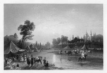 sunset · city · river · animal · animals · asian · asia · middle east · country · science · continent · solar system · astronomy · geography · twilight · holy land · camel · camels · tent · tents · location · century · damascus · syria · riverbank · syrian · capital city · monochrome · engraving · publication · 19th century · encampment · black white · black and white · nineteenth century · geographical feature · engraving · landscape · the holy land and asia minor · pharpar · barrada · john · robert sands · william henry bartlett · bartlett · william henry · w h bartlett · wh bartlett · john carne · carne · sands · robert · The Print Collector/Heritage Images