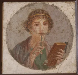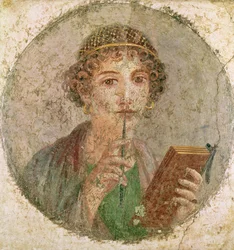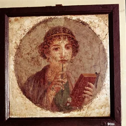 Portrait of Sappho, Greek poetess. Roman woman with book and pen, from Pompeii, Naples, Italy(Portrait assumes of Sapho (or sappho) Greek poetess. Roman woman with book and pen (stylus or style), from Pompei, Naples, Italy)Roman |