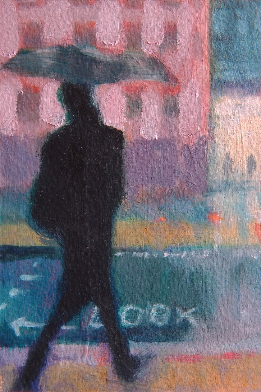 rain · raining · meteorology · weather · climate · science · city · london · commute · crossing · city in the rain · umbrella · man with umbrella · pink building · silhoutte of man · silhouette of man with umbrella · evening · evening in city · balstudio · painting · painting · mzpainting · interiordesignok · Private Collection / Bridgeman Images |