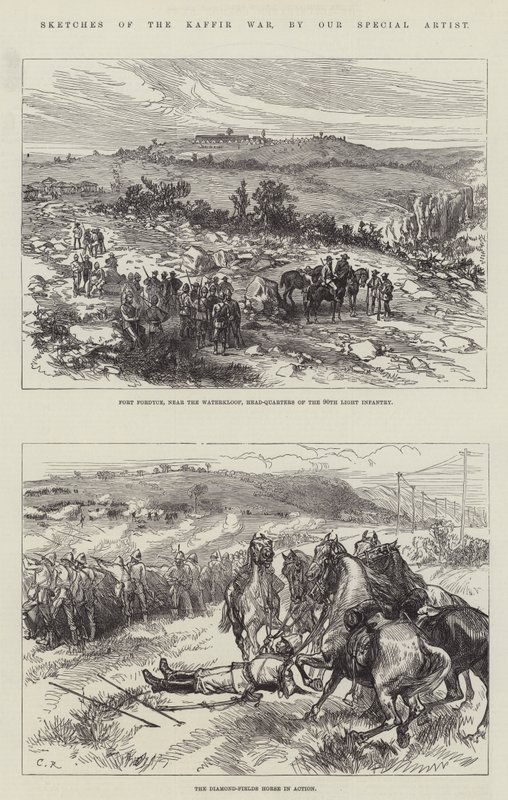 sketches · kaffir war · fort fordyce · waterkloof · head quarters · 90th light infantry · diamond fields horse · action · xhosa wars · military · horses · south africa · Private Collection / Bridgeman Images · / Look and Learn |