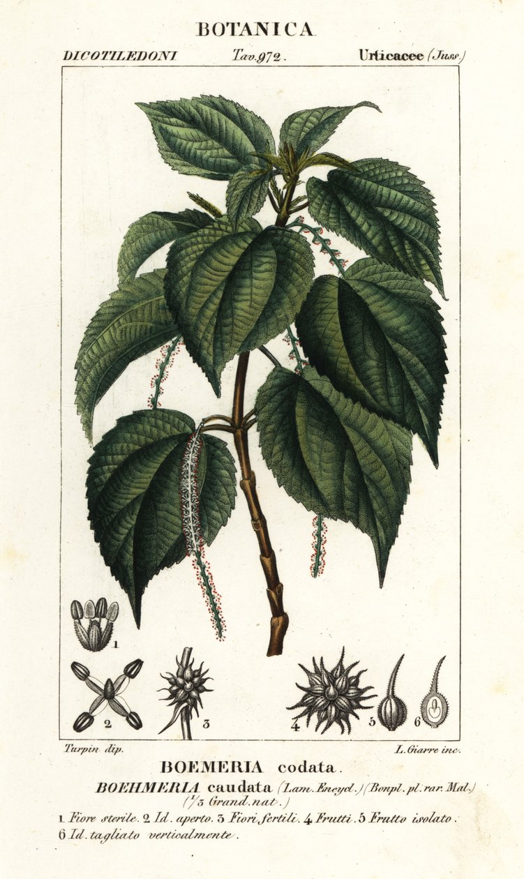fruit · botany · botanical · natural history · science · food · false nettle · boehmeria caudata · boemeria codata · l. giarre · handcoloured · copperplate · stipple engraving · dizionario delle scienze naturali · dictionary of natural science · florence · italy · illustration · pierre jean-francois turpin · botanical illustration · plant · edible · vegetable · science · natural history · botany · antoine laurent de jussieu · / Bridgeman Images |