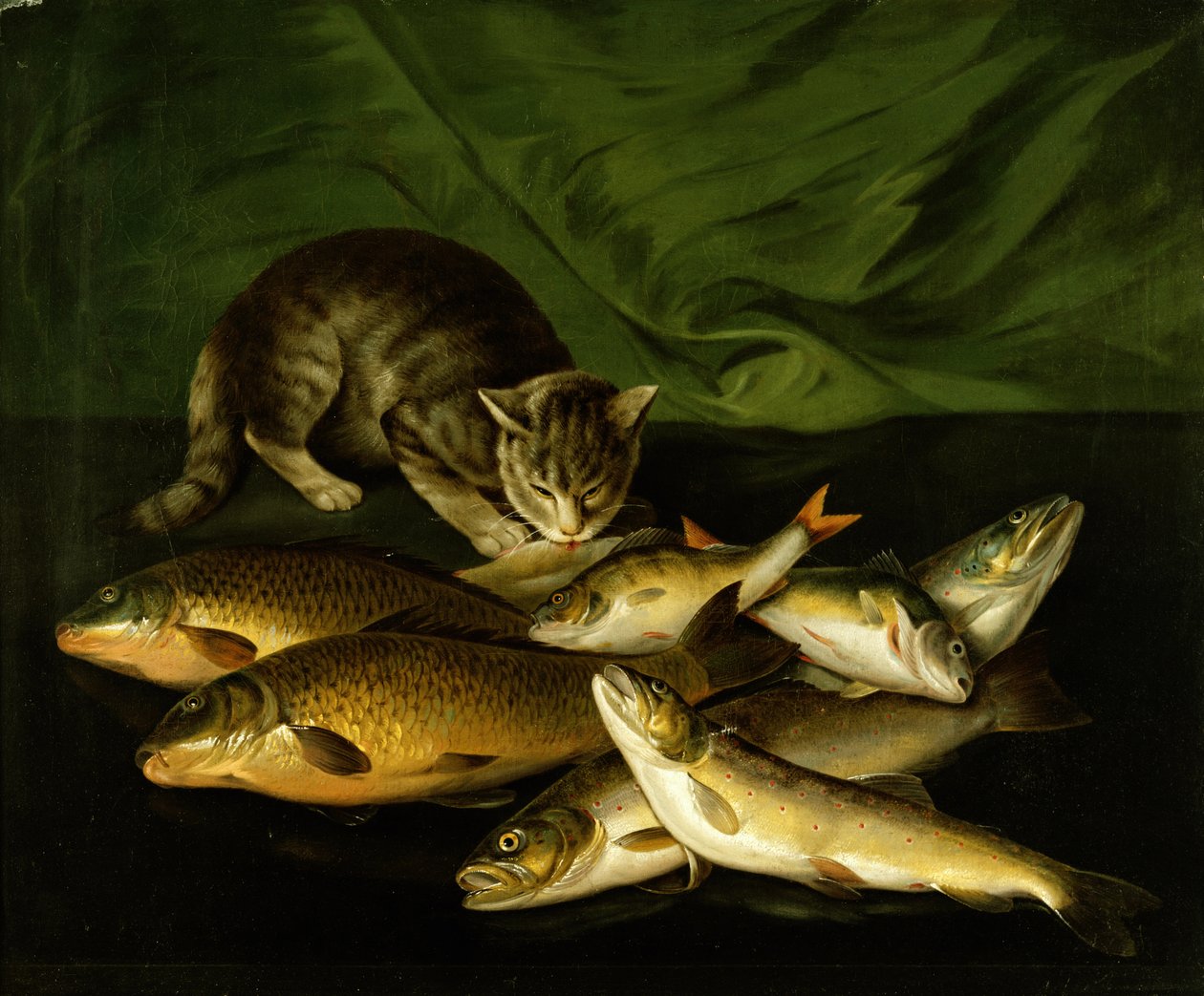 A Cat with Trout, Perch and Carp on a LedgeStephen Elmer |
